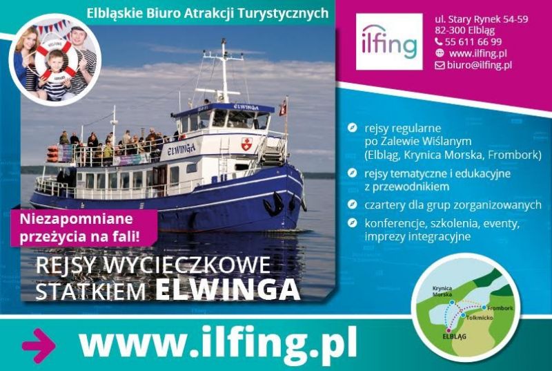 - rejsy spacerowe po rzece Elbląg, po Zalewie Wiślanym w Tolkmicko, Krynicy Morskiej i Fromborku,